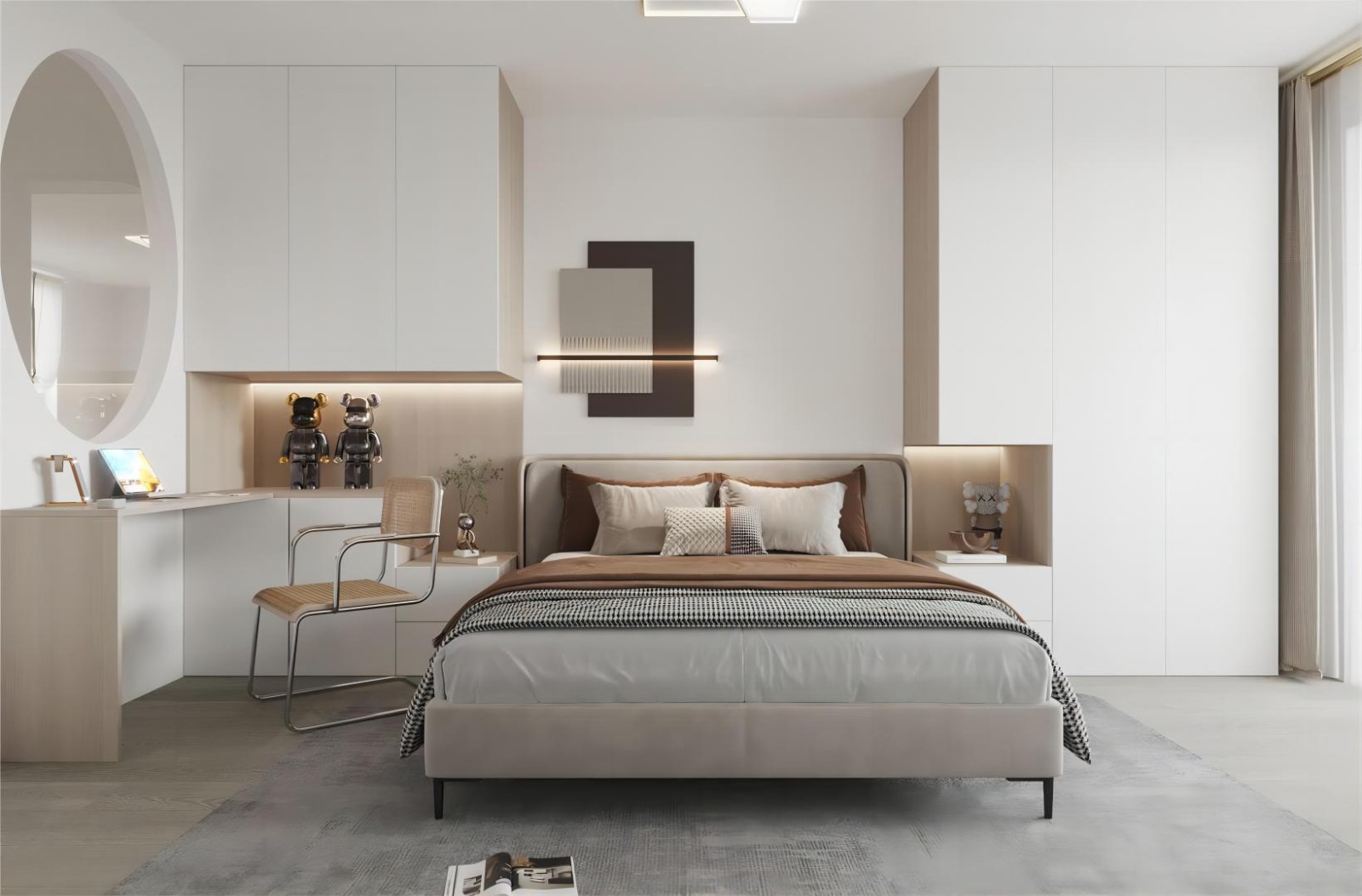 在主卧室的设计上,经过多方面的考虑以后,我们更换了柜子摆放的位置,常规柜子是应该在开门墙体一侧,但是这样做,实体墙背后的公共空间将不会得到一点采光,所以早在设计的过程中,我一直就在思考,觉得更合适的方式,就是将双人床放在中间,在床的两侧利用充足的空间做分体式衣柜,原始衣柜墙开窗透光,窗下放置了平常男主人需要的办公桌,这样的设计既新颖又实用,木色搭配白色组成的柜体