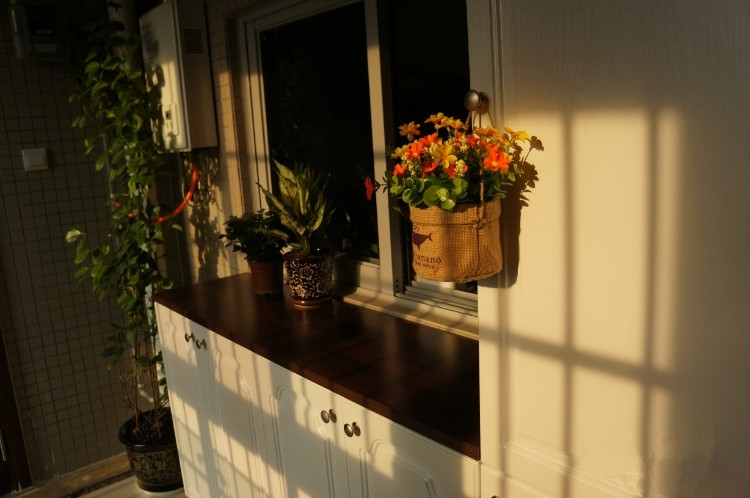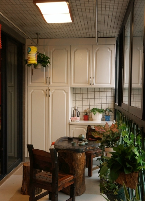 阳台的灯,比较中式,两边的挂杆晚上晾衣服,一进阳台的最左边是储物柜,订制的时候特地用了厨房橱柜的材料,防水、防晒、防潮。