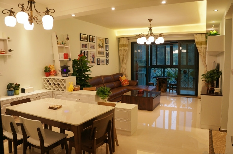 媲美效果图的客厅实景图,客厅一共由9盏射灯,11米长灯带,8(客厅)+5(餐厅)全铜花灯组成,灯全部用暖白色,明亮温暖。