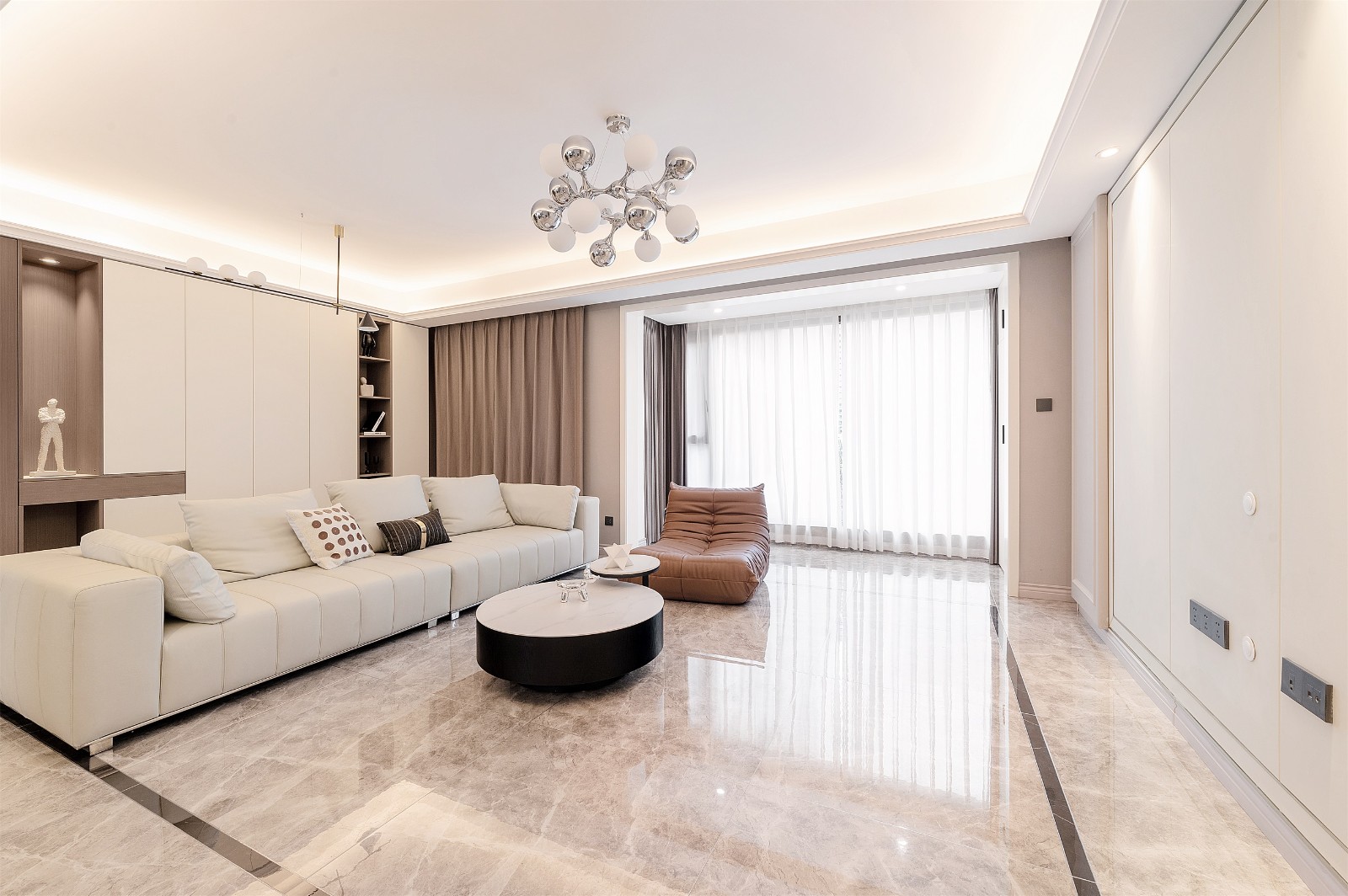 软装部分选用了***白色的皮质沙发,体感柔软亲肤,造型大气,透气耐脏好打理,旁边搭配圆形组合茶几和棕色的Togo单人沙发,沉稳有层次。 值得一提的是Togo的毛毛虫懒人沙发是采用的无支架设计,整体的高回弹海绵加上亲肤皮料让它更加柔软舒适,材料也是十分耐脏和透气。